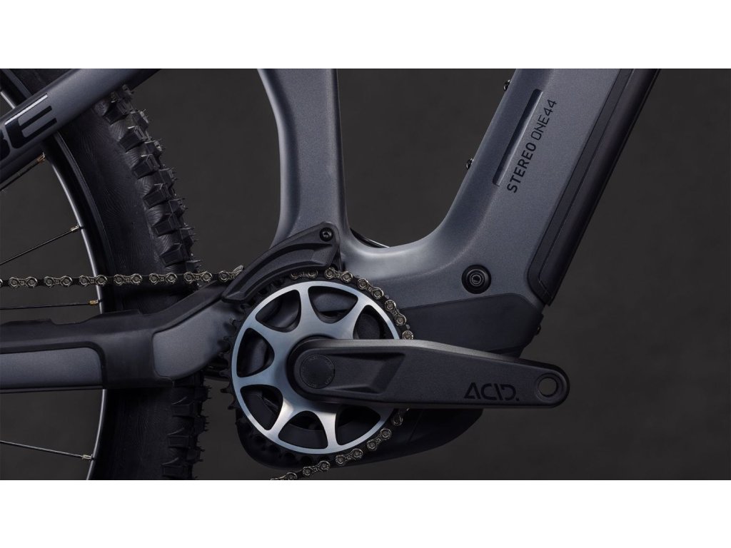 Stereo Hybrid ONE44 HPC má rám prepracovaný do posledného detailu – presne tak, ako sa na poriadny trailový e-bike patrí. Hlavový uhol si môžeš doladiť vďaka nastaviteľnému hlavovému zloženiu, uhladený dizajn podčiarkuje vnútorné vedenie káblov, a čistotu pohonu zabezpečuje praktický chránič reťaze. Ovládač Bosch je decentne zabudovaný v hornej rúrke, a s displejom Purion 400 máš všetko dôležité stále na očiach. Karbónový predný trojuholník v kombinácii s 150mm vidlicou a 140mm zadným zdvihom je pripravený zjesť aj najdrsnejšie traily. Nechýba ani UDH pätka a široká ponuka veľkostí vďaka systému Size Split.